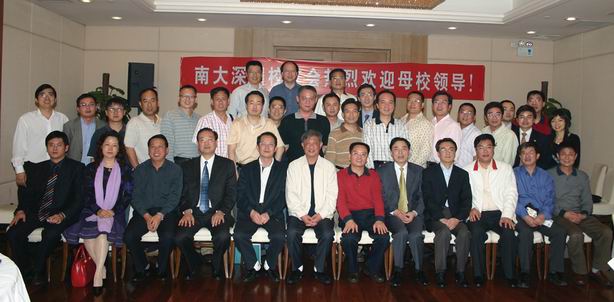 图片说明:陈骏校长(前右五)、施建军常务副校长(前右三)、校友总会韩星臣会长(前左六)与深圳校友会欧阳兴荣会长(前右六)等校友们亲切合影。