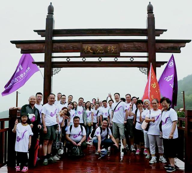 9时之后,雨水渐弱,大伙们统一换上整齐的文化衫,整队进山。沿着蜿蜒的山路,校旗和会旗在最前方飘扬指引,队伍中校友们放飞心情,时而进行行业讨论,时而回顾学校生活,时而又被一个笑话带起一片笑声,时而又有人唱起了山歌。路过英雄纪念碑,走过状元坊,经过龙象塔,青山薄雨中,扶老携幼,其乐融融。校友们将欢笑留在山中,将时间凝固在影像中,将情谊放在酒中,将对母校的热爱深深地埋进心中。
