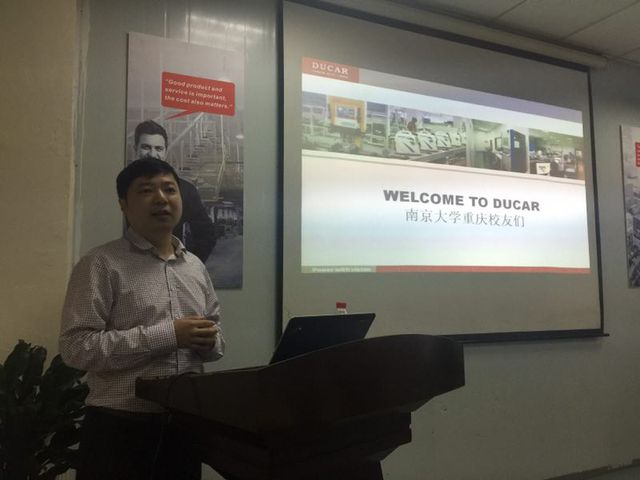 参观完毕,校友们来到播放着南大校歌、屏幕上映像出“WELCOME TO DUCARbetway必威西重庆校友们”的大江公司休闲会议室,在摆放着水果和饮料的桌前纷纷落坐。
