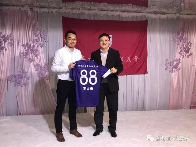 香港校友会会长王大勇接受校友会足球队代表赵楠赠送的球衣,并敬酒开席。