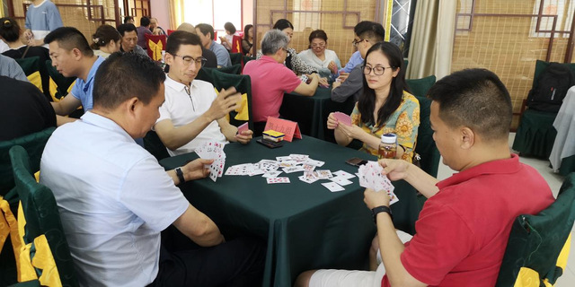 下午1点,掼蛋比赛正式开始。参赛校友与嘉宾按照提前分好的16个小组,对号入座进行比赛。经过前两轮的激烈角逐,层层淘汰,第三轮有4组进入决赛,比赛也到了白热化阶段。掼蛋比赛考验的不仅仅是牌技,更多的是团队协作、心态等因素,大家在比赛过程中也能增进了解、加深情谊,以牌会友。最终,通过决赛产生了鼓励奖4人、三等奖6人、二等奖4人,一等奖被来自黄冈商会的陈令霞、何红先2人收入囊中。领导们为获奖者颁发证书和奖品。