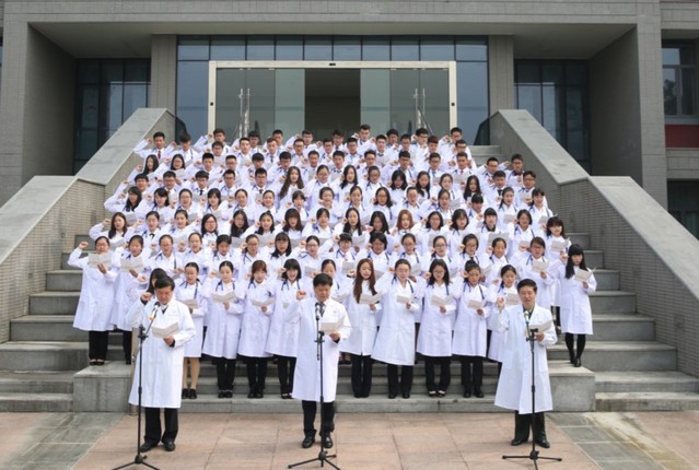 仪式结束后,全体师生来到基础医学教学中心楼前,医学院2017级新生在韩光曙教授、胡勤刚教授、赵建宁教授的带领下进行医学生宣誓,“健康所系,性命相托”……庄严的誓词将永远回响在每一位学生的从医生涯中。