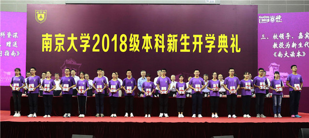 校领导、嘉宾、院士与人文社会科学资深教授为新生代表佩戴校徽,并赠送浓缩经典图书的《南大读本》与《新生学习指南》。