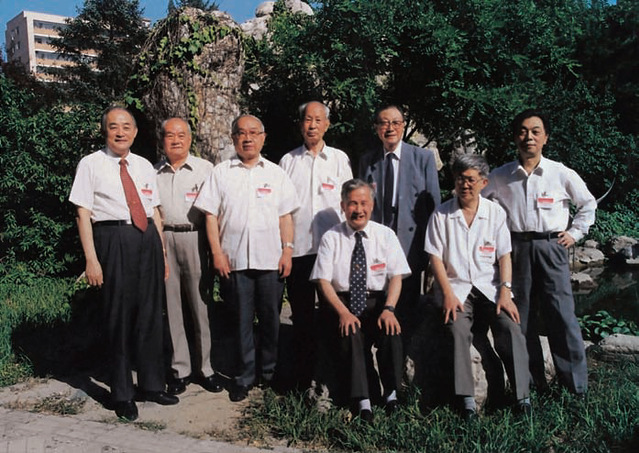 2000年中国科学院第十次院士大会召开期间,南大地质系部分系友合影。左起:孙枢、张本仁、王德滋、田在艺、薛禹群、李德生、戴金星、安芷生