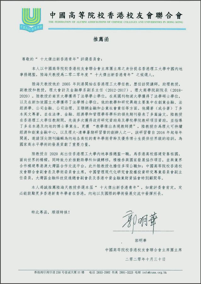 2020年12月6日,2020年“十大杰出新香港青年”评选结果揭晓,我校1997级国际经济法系本科校友、香港理工大学终身教授陆海天入选。公开资料显示,此次活动由益利乐生教育基金特别呈现;“十大杰出新香港青年”评选组委会主办,港漂圈承办...