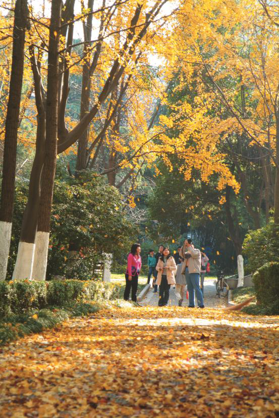 我们去曲阜见过孔林内杏坛边的杏树,春暖花开,繁花似锦,那是宋以后的遗物。而孔子所言之杏应是我国的国树,银杏。传说他曾带领弟子植过银杏,银杏结实丰硕,代表弟子遍及天下;树干笔直挺拔,象征着学者的品格正直;银杏既能食用,又能入药,寓意着学子要成为有用之才;银杏树高大坚实是架桥造屋的首选,昭示着学子要成为国家栋梁。不知是否领悟了杏坛的原旨,还是冥冥之中的暗合,教学楼左右行道树几乎全种上了银杏,春来如翠旗飘扬,入秋似煌炬盛燃。尢其是深秋,金黄色的叶片带着成熟后的辉煌,如涅槃的凤凰,在风中翩跹着,飞旋着,把个校园妆扮得如同“满城都是黄金甲”。倘若有心捡拾一枚树叶如金铭玉佩珍藏于怀,足以温热一个寒冬。