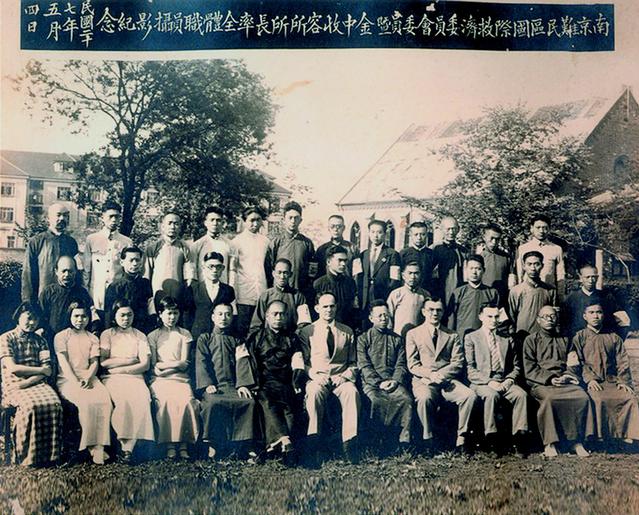 1938年5月4日,南京难民区国际救济委员会委员暨金中难民收容所全体职员在干河沿金中小礼堂前合影。前排左3徐淑珍、4徐淑德、6姜正云(金中难民所所长)、7约翰·马吉(南京国际红十字会会长,被誉为美国英雄,南京十二中创办人)、9金大教授贝德士、10金大教授史迈士、11徐传音先生
