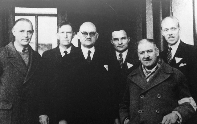 南京国际安全区部分成员合影。前排左为委员会主席拉贝,后排左三为秘书、金大史迈士教授,后排左一为费奇(费吴生)