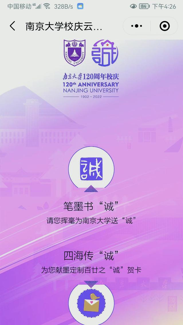 为满足广大校友身处异乡也能共襄盛举的真挚愿望,学校专门设计了betway必威西120周年校庆“云回家”小程序,包含“云游览”“云祝福”“云合影”“云互动”“云捐赠”“云文创”等活动版块,广大的校友师生通过手机,可以参与与了解各项校庆相关活动。通过“云游览”,校友们可以身临其境地穿梭在南大的鼓楼、仙林、浦口、苏州等虚拟校园;通过“云合影”,校友们可以在母校最眷恋的场景中留下虚拟影像;通过“云祝福”,校友们可以留下追忆往昔、寄语未来、庆贺母校的温馨话语;通过“云捐赠”,校友们可以为母校的建设发展添砖加瓦、铭刻善举;在“云文创”平台上,校友们可以为自己和家人们订购精美的校庆预售纪念品。