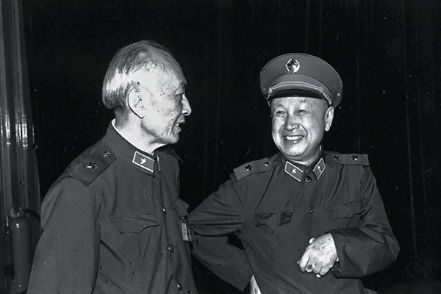 1987年4月,在国防科工委高技术发展工作会议上,钱学森(右)与朱光亚亲切交谈