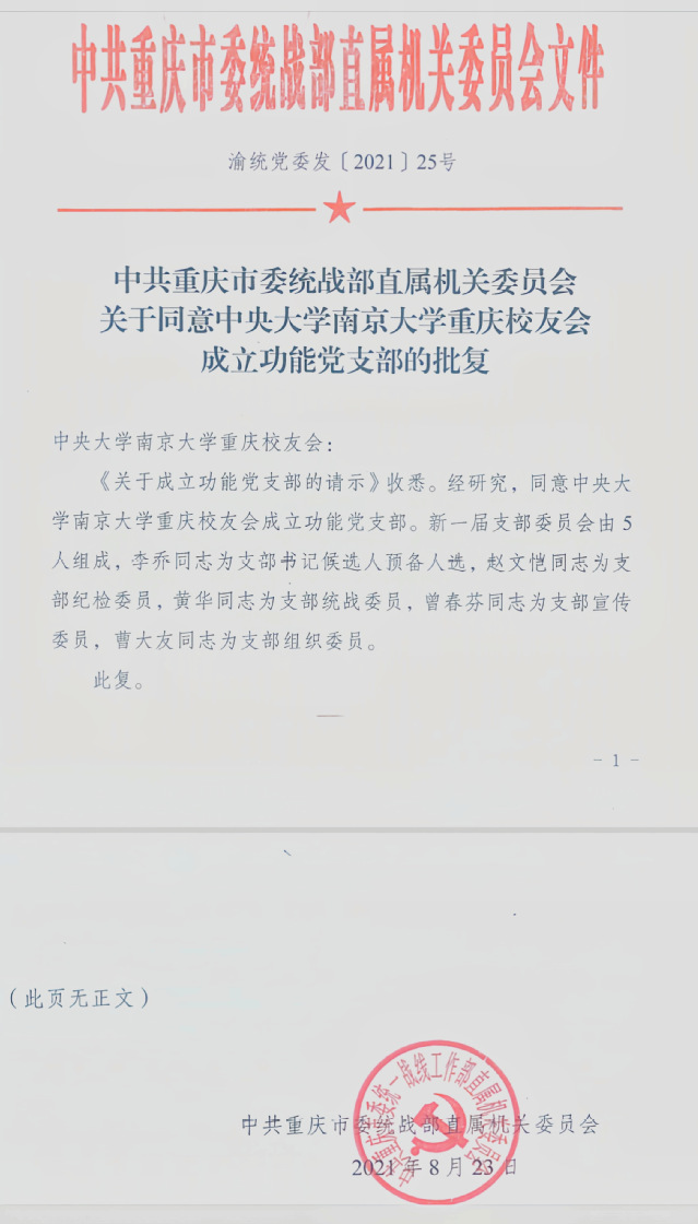 中共重庆市委统战部直属机关委员会关于同意中央大学betway必威西重庆校友会成立功能党支部的批复