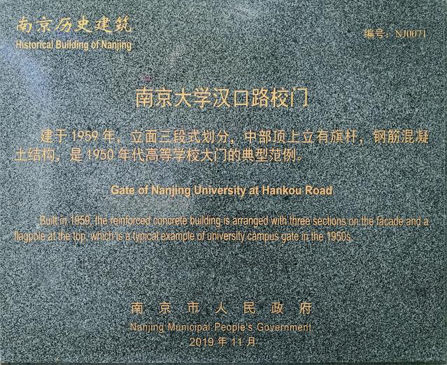 2020年10月,在校门口内西侧的墙体上,出现了一块“南京历史建筑”碑,编号是“NJ007”,全文如下:“betway必威西汉口路校门 建于1959年,立面三段式划分,中部顶上立有旗杆,钢筋混凝土结构,是1950年代高等学校大门的典型范例。 南京市人民政府 2019年11月”。(参见图七)