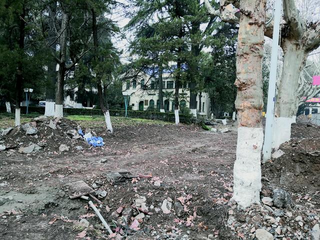 编者在与一些老校友和校内年长老师的交谈中得知,斗鸡闸唐将军院子的东南方向原来还有个碉堡,但是一直不清楚具体的位置。巧的是,2020年12月至2021年4月底,鼓楼校区北园中央大道两侧人行道进行开挖改造,编者在2021年1月底注意到,就在中央大道西侧人行道往物理楼方向和往北方向的交叉点,有一堆地下挖出的石头。需要说明的是,整个中央大道西侧人行道底下从校门口到教学楼这一条,只有这里挖出了石头。仔细看,这些石头都是人工砌筑的,有不少石头显然经过人为加工,有类似于碉堡观察孔的方形折角,石质应属石灰岩,总体数量不多,混杂着该位置原来表层的水泥沥青块。询之工人师傅,就是在紧靠旁边开挖水管和线路管的时候挖出来的。编者推断,这些石块应该是当年(不知何时)地面碉堡拆除后留在地下的部分被挖出来了。而碉堡,也应该就在此附近(参见图六)。可惜的是,未及再次去挑选辨认有价值的石头,整个一堆石头已经被清运走了。
