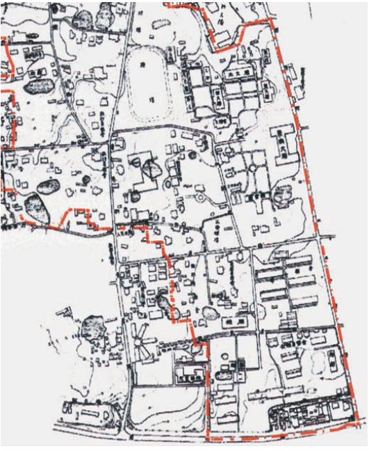 由此可见,原来进入北园后的道路比较狭窄,当时的校门位置应在今天校门往东一点。据校友回忆,“原来的大门十分简陋,好像是木条搭建的牌楼状建筑。”至于往南园的校门,编者从旧地图上分析(参见图五),也并非现在的位置,不是正对着北园校门,而是再往东侧,在今天中山楼的东侧,一直通往八舍。