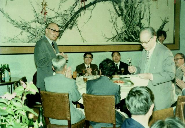 1987年5月14日,会议告别宴会,原校长匡亚明(左1)、校长曲钦岳(左2)、副省长陈焕友(左3)、魏荣爵院士(左4)、冯端院士(右1)
