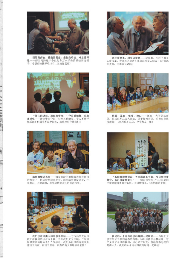 半个世纪的风雨沧桑没有磨蚀我们情系母校、心铭师恩的拳拳之念。历经三年的翘首企盼,我们——南大地质系本科1955届学友的毕业50周年纪念聚会,如约于2005.9.25.—27.在南京圆满举行。当占2/3强的17位从国内外各地归来的学友,相偕回到当年一起学习和生活的母校时,但见旧时景色依稀可辨,往事历历犹如昨日;然而,师生重逢已耄耋,同窗相聚皆古稀!身处此时此地,谁人能不心潮澎湃,既感慨万千又无比兴奋与欢乐!正是:同窗四载谊长在,分袂五旬情更深!