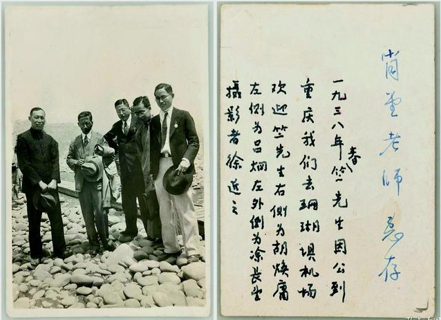 胡焕庸说明:一九三八年春竺先生因公到重庆我们去珊瑚坝机场欢迎竺先生右侧为胡焕庸左侧为吕炯左外侧为涂长望(和陈忆帆)。