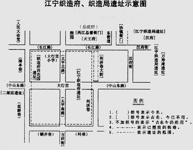吴新雷最值得称道的是采用社会调查与文献调查相结合的方法,推进了曹学研究。如南京有个地名叫大行宫,这里曾是康熙皇帝与乾隆皇帝下江南时居住过的行宫。它最初实际上是曹寅利用江宁织造府扩建而成的。吴新雷在方志中发现有不少这方面的记载,如《嘉庆江宁府志》卷十二《建置》称:“江宁行宫,在江宁府治利济巷大街,向为织造廨署,圣祖南巡时,即驻跸于此。”吴新雷还通过实地调查与文献调查相结合的方法,考明了曹寅时代江宁织造府的地理位置与内部结构。甚至画出了《江宁织造府、织造局遗址示意图》,并从乾隆年间编印的《钦定南巡盛典》中找到了一幅“由南京织造府扩建的南京行宫图”(题目为吴新雷所拟)。两相对照,当年的江南织造府及据以扩建的行宫的地理位置与内部结构就一目了然了。今将其《江宁织造府西园的新发现》一文中涉及现场查勘部分录之如下: