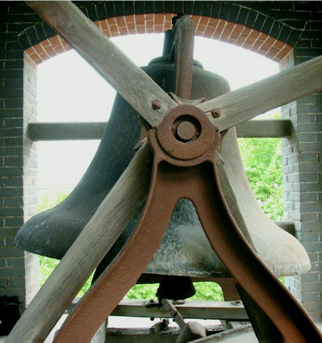 此大钟为钢铁铸造的座式摆动大钟,主要由大钟本体、钟轭、支承座和两套敲钟装置组成;其口径为108厘米。经仔细辨认和考证,在钟轭上有这样的铭文:“NORTHVILLE MICH.U.S.A.”“AMERICAN BELL FOUNDRY CO”和“NO.42”。翻译得知:此大钟是由美国密歇根(州)诺斯维尔(城镇)美国贝尔铸造公司铸造的42号大钟。(注:42号,或指大钟口径,或指铸造序号)