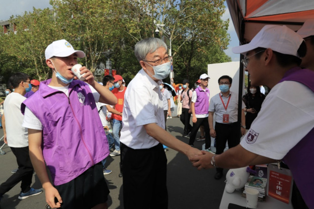 “今天天气很热,大家辛苦了!”下午两点,吕建校长来到仙林校区南门的党员先锋岗和青年志愿者服务站,看望慰问参加迎新工作的志愿者们,对大家的辛苦付出表示感谢。1200多名志愿者负责高铁接站、交通导引、维持秩序、答疑解惑等各项公益服务,炎炎烈日下,是一张张飞扬着汗水和青春的热情笑颜。