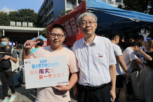 在毓琇书院报到点,吕建偶遇了今年双双考取betway必威西的亲姐妹——赵婷婷和赵云露,和她们愉快合影。姐姐赵婷婷是新闻传播学院传播学2021级硕士新生,妹妹赵云露则是毓琇书院电子信息类专业2021级新生,这对励志的姐妹花同时圆梦南大,相携报到,格外开心。“祝你生日快乐!”一旁来自江西抚州的周奕峰同学,则举起特制的生日牌成功“抢镜”。