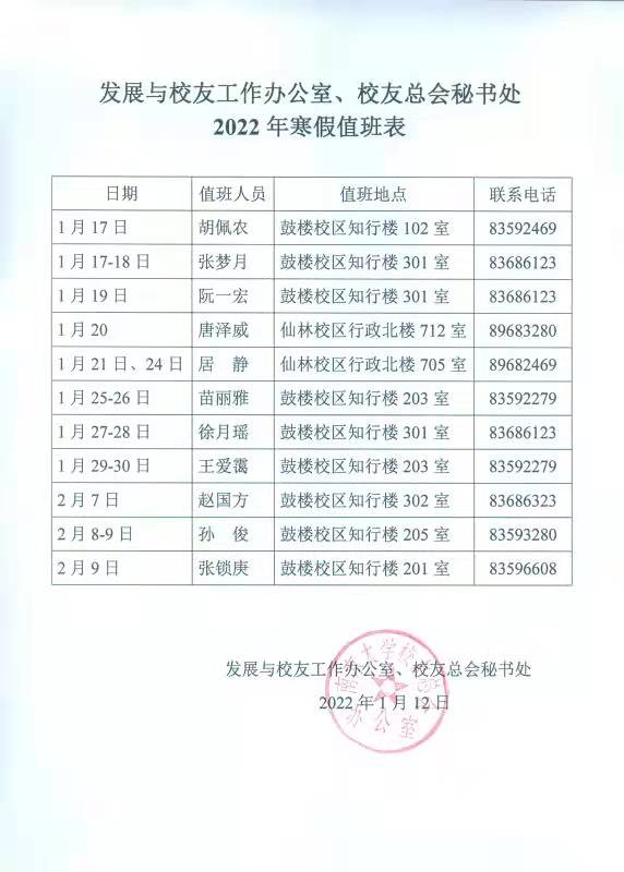 发展与校友工作办公室、校友总会秘书处2022年寒假值班表