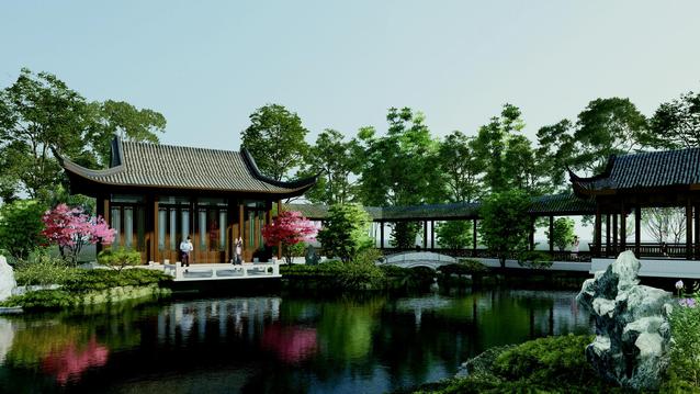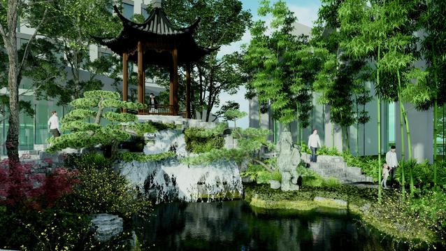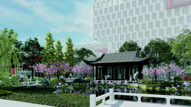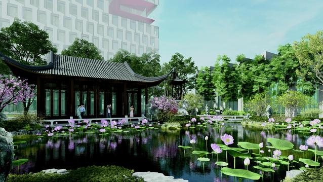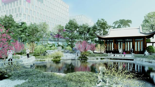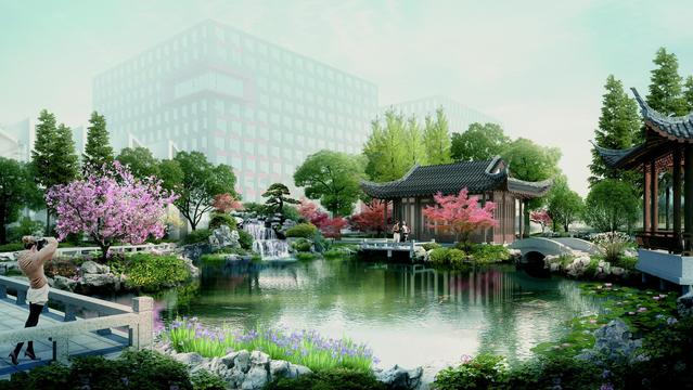 学术及科研交流区位于一期南侧,包含学术交流中心和科创大厦,设计以建筑布局为基础,重点强化建筑的入口空间。其中学术交流中心、科创大厦之间的两座苏式庭院尤具特色,彰显苏州地域文化,在现代风格的建筑群落之间,低调内敛又不失人文意趣。