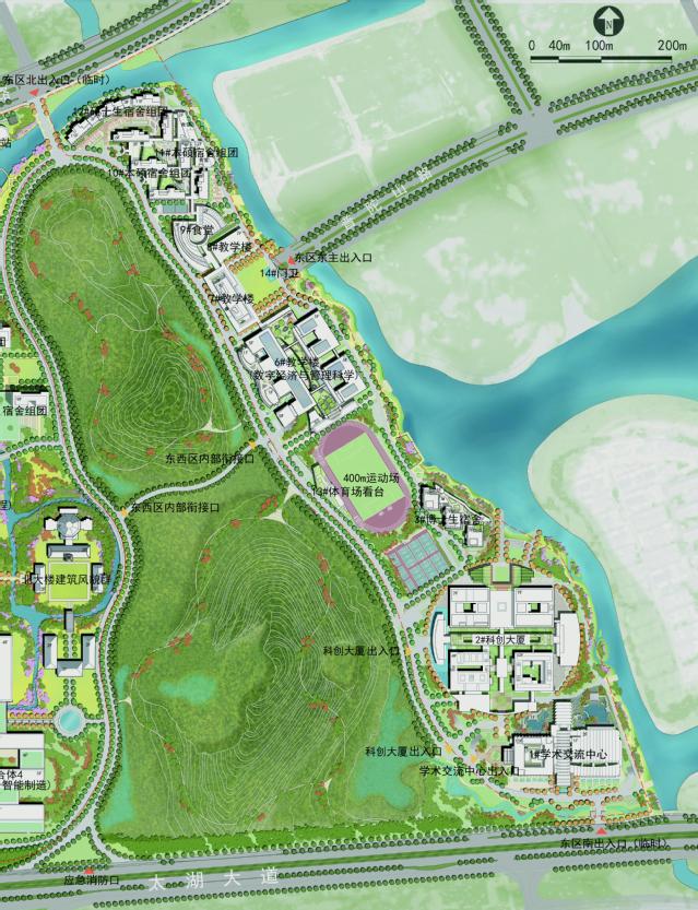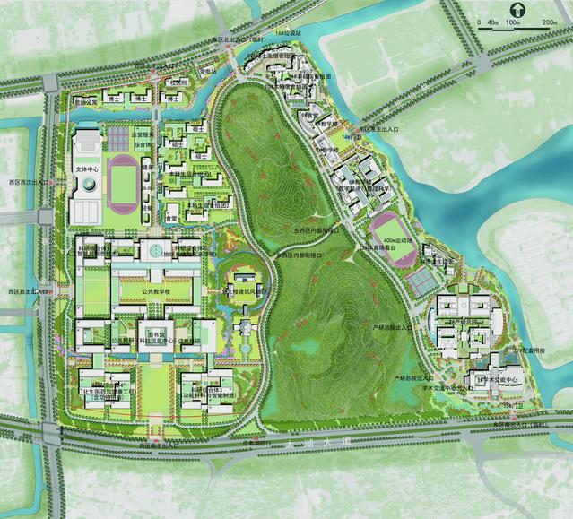 运动场区结合眺望九曲河景致,规划观景草坪广场及休憩带,衔接两侧水岸步道及休憩平台,延伸至博士宿舍区。丰富的植物层次,为学生营造了良好的休憩空间与运动场所。植绿成带,掩映空间,运动场地与住宿区咫尺之隔。