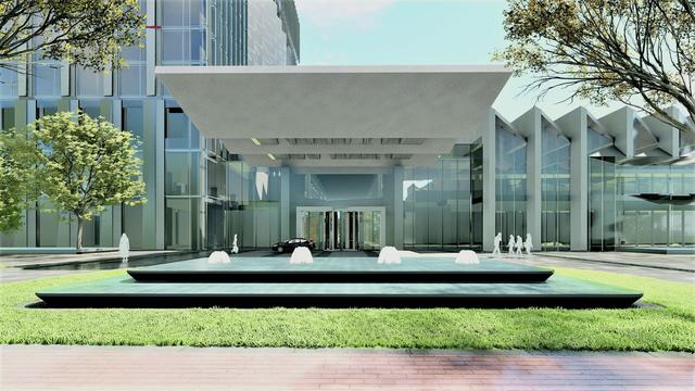 环绕并映照建筑的水景池,打造科创大厦西侧入口高端、简约的入口形象。