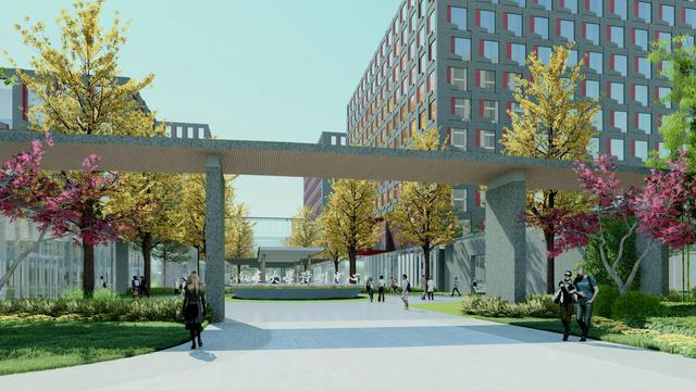 科创大厦景观设计强化建筑“天圆地方”的空间概念,主入口强调中轴,延续至北侧水岸,取印照天地、建筑与景观串联之意象。中轴入口两侧景观区,点缀乔木花池座椅,提供座椅休憩。入口圆环以列植银杏为中轴,端景设置公共艺术,形成视觉焦点。