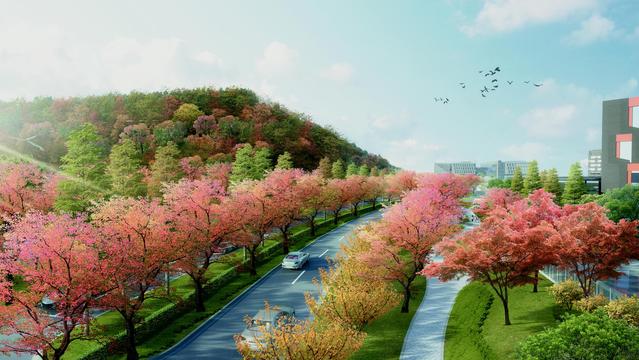 枫香大道致敬苏州天平山、南京栖霞山两大赏枫胜地,形成南大苏州校区独有的景观风貌。绿化配置以枫香为主,结合樱花、紫薇、玉兰等开花树木,背景林以雪松、银杏、水杉、无患子等常绿林或色叶林为主,结合庄里山自然林相,形成四季变化的自然特色景观大道。
