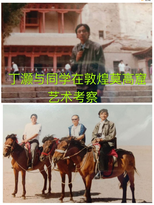 上图为丁灏在莫高窟博物馆前。下图骑马者(左起):李文鹏、王瑞久、丁灏。