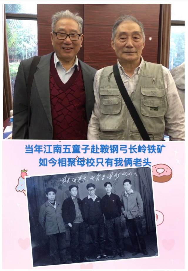 这张老照片展示我们"江南五童子"(自左至右为:林复兴、张祖林、本人、陈增义、林嘉明),刚毕业分配到鞍钢弓长岭铁矿工作,时隔半个多世纪,五童子只来了两老头相聚(本人和林嘉明)。健康十友谊永远是人生的主题。