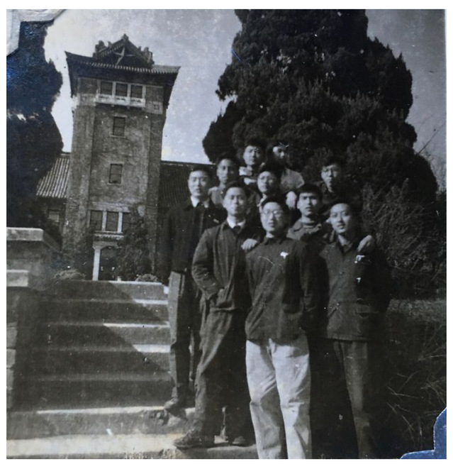 1962年春地勘二班部分同学在北大楼草坪广场合影留念。 由前向后、自左至右为: 盛田坤(本人)、张祖林、刘源森(刘青)、刘荣谟、王念华、陶应祥、黄怀曾、戴荣倫、徐刚、李钟鸣。