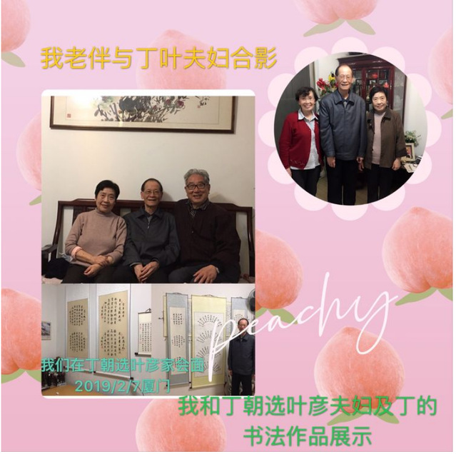 毕业后分别五十多年,2019年春节我们在厦门丁朝选家会面,退休前丁朝选任长沙矿冶研究院厦门分院院长,为总院在福建开拓业务,曾获"汽油节能剂及其应用"发明专利,业余书法颇有成就,多次在全国和市展中获奖。叶彦擅长针绣,真可谓男(笔)耕女绣。更使人高兴的他们二个儿子事业有成,一个是主任医师、一个是中国科学院物理所新材料研究的首席科学家。