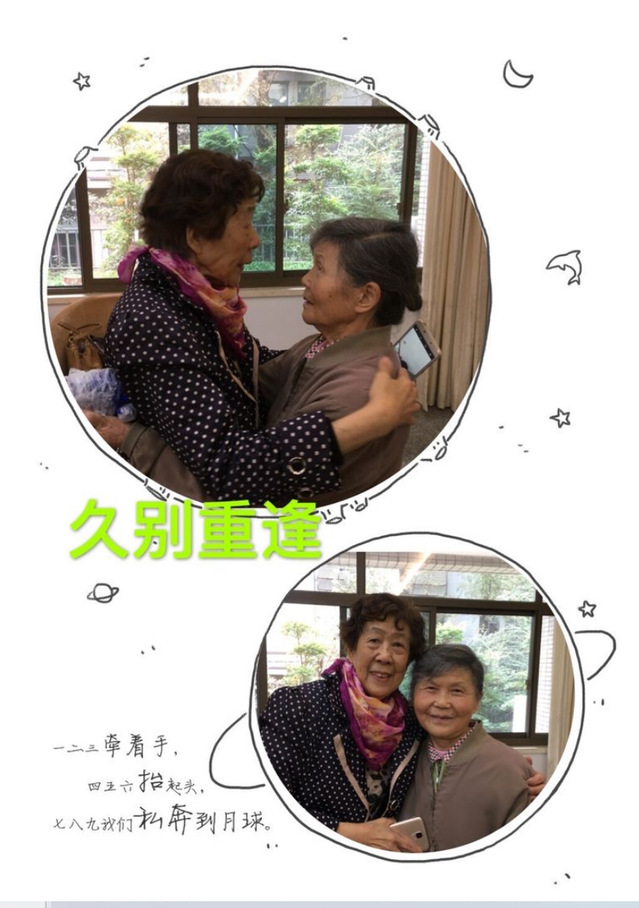 黄榴轩(左)和陆玉梅(右)相见时激动情景。六十年变迁,青春已不再、面貌巨变,同学情常在。南大再相见,又焕发了青春的活力。