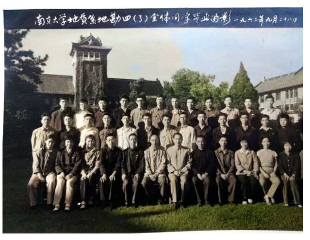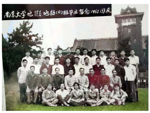 1962年国庆,徐克勤、陈旭、孙鼐、俞剑华等教授,与地勘四班同学在北大楼前合影留念。