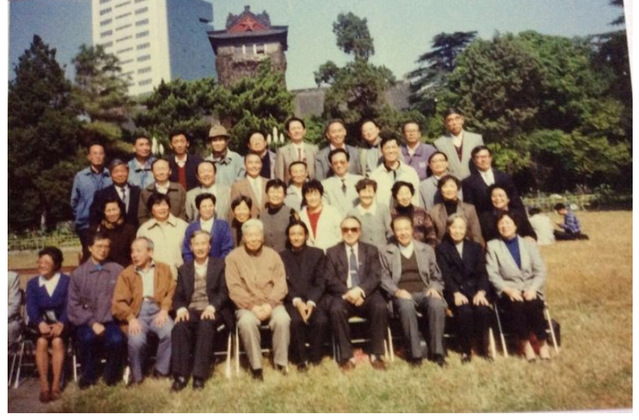 1997年秋水文地质专业部分同学回母校团聚,大家与肖楠森教授和老师们在北大楼草坪合影留念。前排左起为:龚自珍、陈葆仁、华致洁、薛禹群、肖楠森、丁灏、李生林、秦素娟、髙敏。