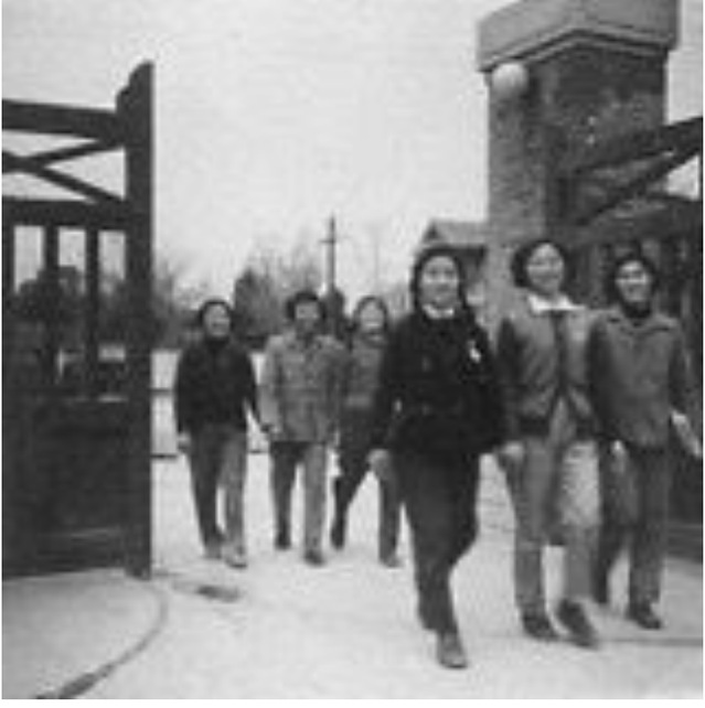 三班女同学在上学的路上(南苑生活区大门口)。前排左起:王祖卿、凌小惠、速玉萱,后排中间唐依筠,左右两边?。