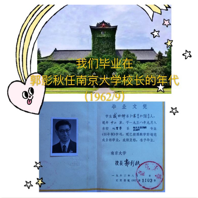 同学在聚会中也聊到"南大人"代代相传的故事,相说上世纪五十年代南大副校长孙叔平教授祖孙三代都是"南大人"的佳话。我们同学这个方阵里,有多少后人成为"南大人",没有统计。地勘同学陶应祥的儿子陶先平就读南大,是现任校长吕建教授的博士生,他毕业后现在又成为计算机系的教授了;安芷生的女儿也由南大化学系毕业后另择深造;很幸运我的儿子盛颖宏也得到化学系江元生教授的教导荣获了博士学位。我想我们同学的后人还有很多是"南大人",⋯⋯祝愿我们的后人继承我们的向往,代代传承成为"南大人"。