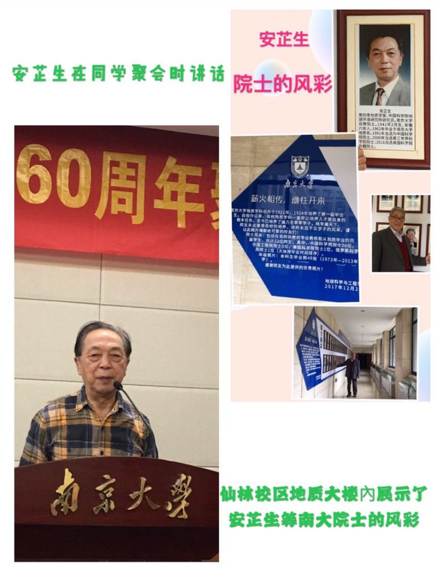 聚会期间,我和老伴到betway必威西仙林校区参观,为南大的发展、规模,创《双一流大学》而欢欣鼓舞,重点参观了《地球科学与工程学院大楼》(原地质系),在大厅瞻仰了徐克勤先生的塑像,在《院士风彩》栏驻足观看南大地质系33位院士的风彩,安芷生同学荣列榜中,我们为他的卓越成就而感到髙兴和荣耀!