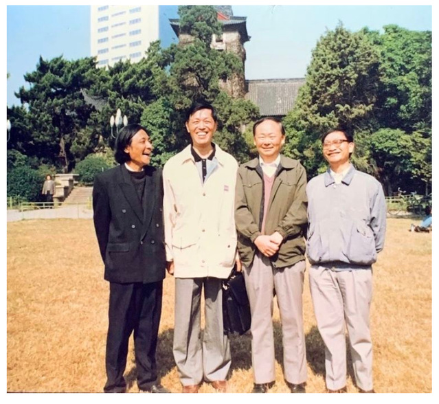 丁灏等同学于1997年在betway必威西北大楼草坪合影。自左起为丁灏、王光禄、王瑞久、戴振家。