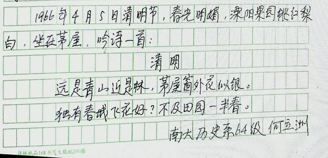 晚上九时,门外雨淅沥、路泥泞。我们正在宿舍里自习,突然陶科长“咚咚”地敲起门来,门一开,一个高大的身影出现了。他拄着一根短竹,穿着一双短靴,满面春风。想不到我们敬爱的匡校长这么晚了还来看我们,我们都有说不出的感动。他今天刚赶来,顾不得休息,来询问我们有没有人生病,安慰我们,这体现了党对我们青年一代的无比关怀。沈祖润激动地说:“谢谢首长的关怀!”大家都拍起掌来,匡校长想了一下说:“不要称首长,学校不同于部队。我们都是同志。”你听,我们的匡校长就是很谦虚,一点架子也没有,他真是我们的好校长。