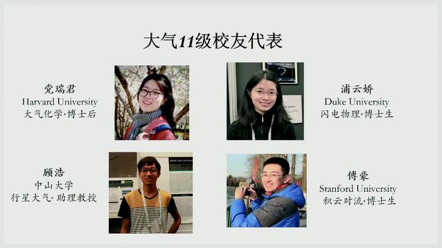 首先做报告的是2011级校友、美国哈佛大学博士后党瑞君同学。她以“我与大气化学”为主题,从“国家需求和个人兴趣”两个维度溯源她的科研初心,并从大气化学研究的内容、手段、价值等方面全方位展示了大气化学的魅力。接着,来自美国杜克大学的博士生浦云娇同学以“闪电物理、电磁波遥感”为主题分享了她对“闪电”这一自然现象的浓厚兴趣,并描述了她从本科阶段开始一路走来的学习和科研过程,从闪电观测到人工引雷,再到磁流体数值模拟、统计物理理论和粒子模拟,她为我们展现一幅“闪电全图景”。来自中山大学的助理教授、2011级校友顾浩,他以“行星科学与行星大气”为主题,介绍了行星科学的起源、发展历史、关注的问题以及未来的展望。让大气学科的同学们对行星大气关注的问题更加感兴趣。传统的研究方向为电磁辐射与粒子辐射的大气效应,而目前新兴的研究方向为行星气候与行星天气。顾浩告诉同学们,行星科学尚属一个年轻的学科,国外已有六十余年研究历史,国内只有十余年,属于一个新兴的融合交叉学科。最后由傅豪同学为大家带来了主题为“从水槽实验到大气对流”的精彩报告。傅豪同学本科在读期间就对水槽实验充满浓厚兴趣并作为他的科研历程的启蒙。他着重和大家分享了他从本科开始以来8年多的研究思维变化以及如何从实验室研究过渡到真实的大气研究过程。4位校友的分享各有侧重,精彩纷呈,报告完毕大家以热烈的掌声感谢了他们的分享。