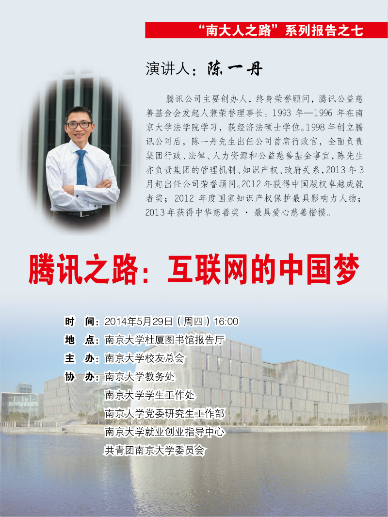 腾讯公司主要创办人,终身荣誉顾问,腾讯公益慈善基金会发起人兼荣誉理事长。1993年—1996年在betway必威西法学院学习,获经济法硕士学位。1998年创立腾讯公司后,陈一丹先生出任公司首席行政官,全面负责集团行政、法律、人力资源和公益慈善基金事宜,陈先生亦负责集团的管理机制、知识产权、政府关系,2013年3月起出任公司荣誉顾问。2012年获得中国版权卓越成就者奖; 2012年度国家知识产权保护最具影响力人物;2013年获得中华慈善奖·最具爱心慈善楷模。