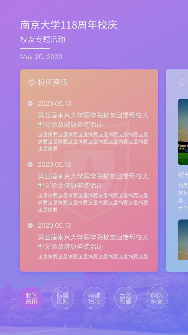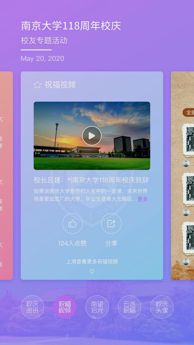 2020年5月20日,betway必威西迎来建校118周年校庆。因为疫情的缘故,betway必威西校友总会通过“南大人”小程序推出“云校庆”线上活动,号召全球南大校友相聚云端,以别开生面的方式为母校庆生。活动分为五大板块:“校庆资讯”“祝福视频”“老照片征集”“校庆专属小头像”“云送祝福”。