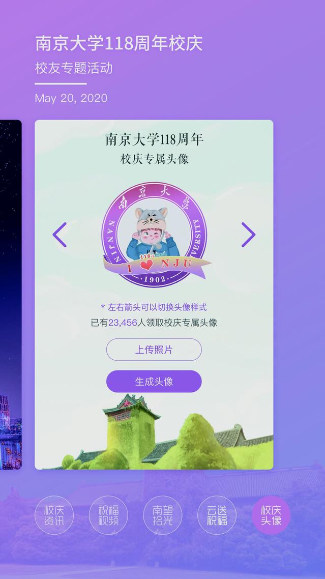 “校庆专属小头像”活动,为广大校友提供三大种类,多个款式的118校庆专属头像,满足各界校友的需求,活动上线仅48小时就有超过5万名校友换上专属头像。头像设计元素“标志性建筑款”包括了汉口路校门、浦口校区校门、北大楼、小礼堂、杜厦图书馆等具有纪念意义的经典建筑。2020年开局即是不平凡的一年,在新冠疫情前面前南大人众志成城,停课不停学,师生们纷纷上起网课;在最难招聘季,“南大人”小程序推出线上云招聘为毕业生保驾护航。校友总会因此专门设计了包括“抗疫款”“网课款”“口罩款”等多个特别纪念款校庆小头像,总有一款,触及心底。
