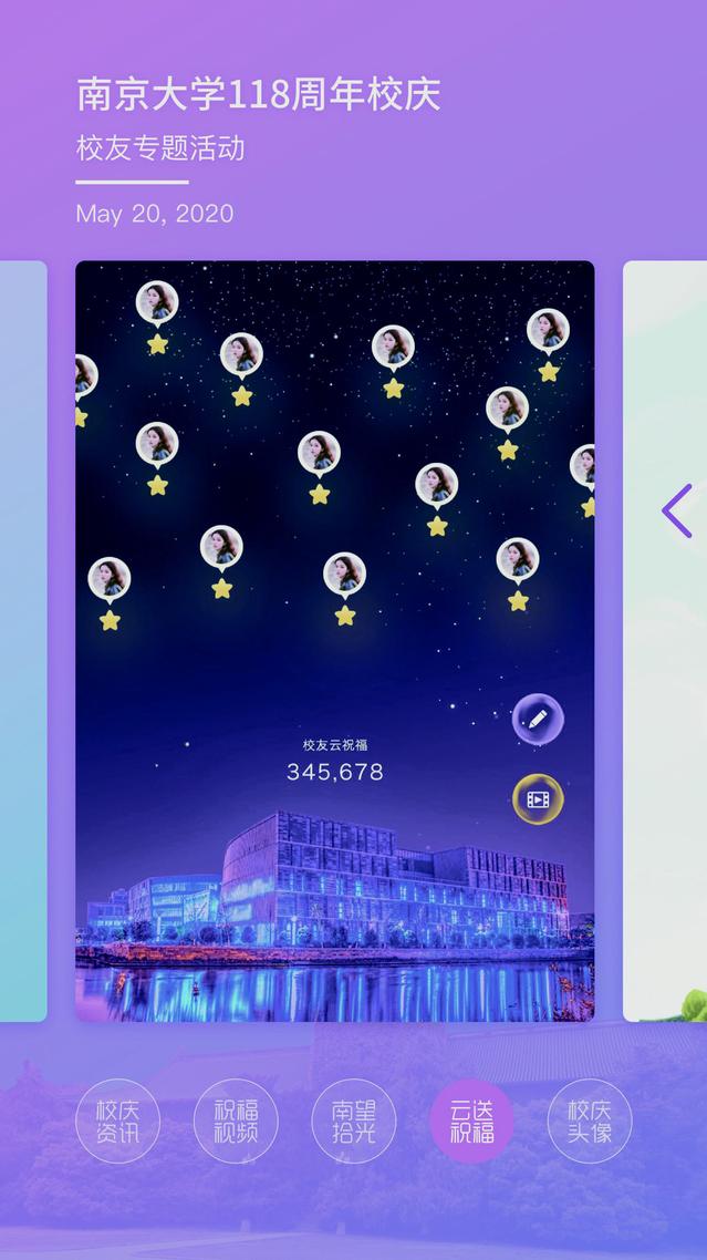 青山一道,祝福相随,“云送祝福”活动为全球南大校友们隔着千山万水为母校送“花式告白”提供了平台。南大校友们可以在这里许下对母校118周年校庆的真诚祝福,写下与南大的款款深情,记录与南大人共同抗疫的点点滴滴,表达对母校的深深思念。活动页面的每条祝福就是一颗暖黄色闪亮的星星,千万条的祝福汇聚成照亮夜空的光芒,点缀南大的夜空。
