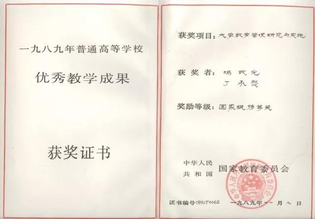 冯致光先生在担任betway必威西教务长和分管教学的副校长期间,锐意教学改革,为改革教学体系,提高本科教学质量,做出了卓越的贡献。他提出“全面培养、强化基础、因材施教、增强活力”的思路,确立了以“课堂教学、学术活动、科学实验和社会实践”为主体的“三元结构”模式。并且领导进行了一项重大教学改革实践“五个一套”,即:“合理科学的课程大纲,适应社会发展的教材,优秀的教师队伍,科学合理的考核办法,实习实验基地的配套”。由于教学管理出色,冯致光、丁承憼等完成的“大学教学管理研究与实施”教学改革成就于1989年荣获国家级教学成果特等奖。