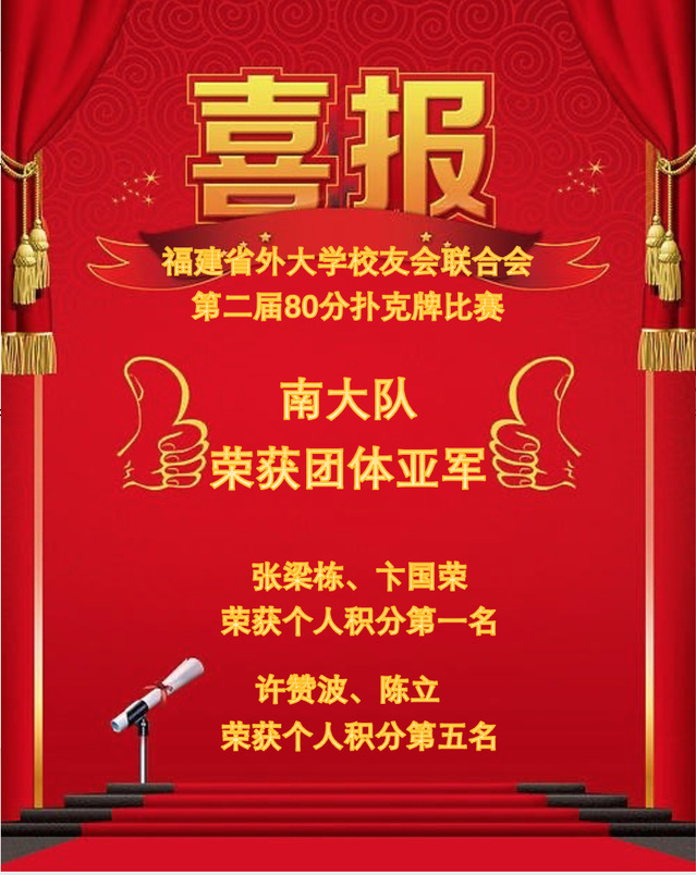 10月24日,福建省外大学联合会第二届80分大赛在石鼓别苑正式打响。经过6轮激烈的角逐,南大队在27个参赛学校中荣获团体亚军。其中张梁栋校友与卞国荣校友一队在70组参赛选手中杀出重围,荣获个人积分冠军。